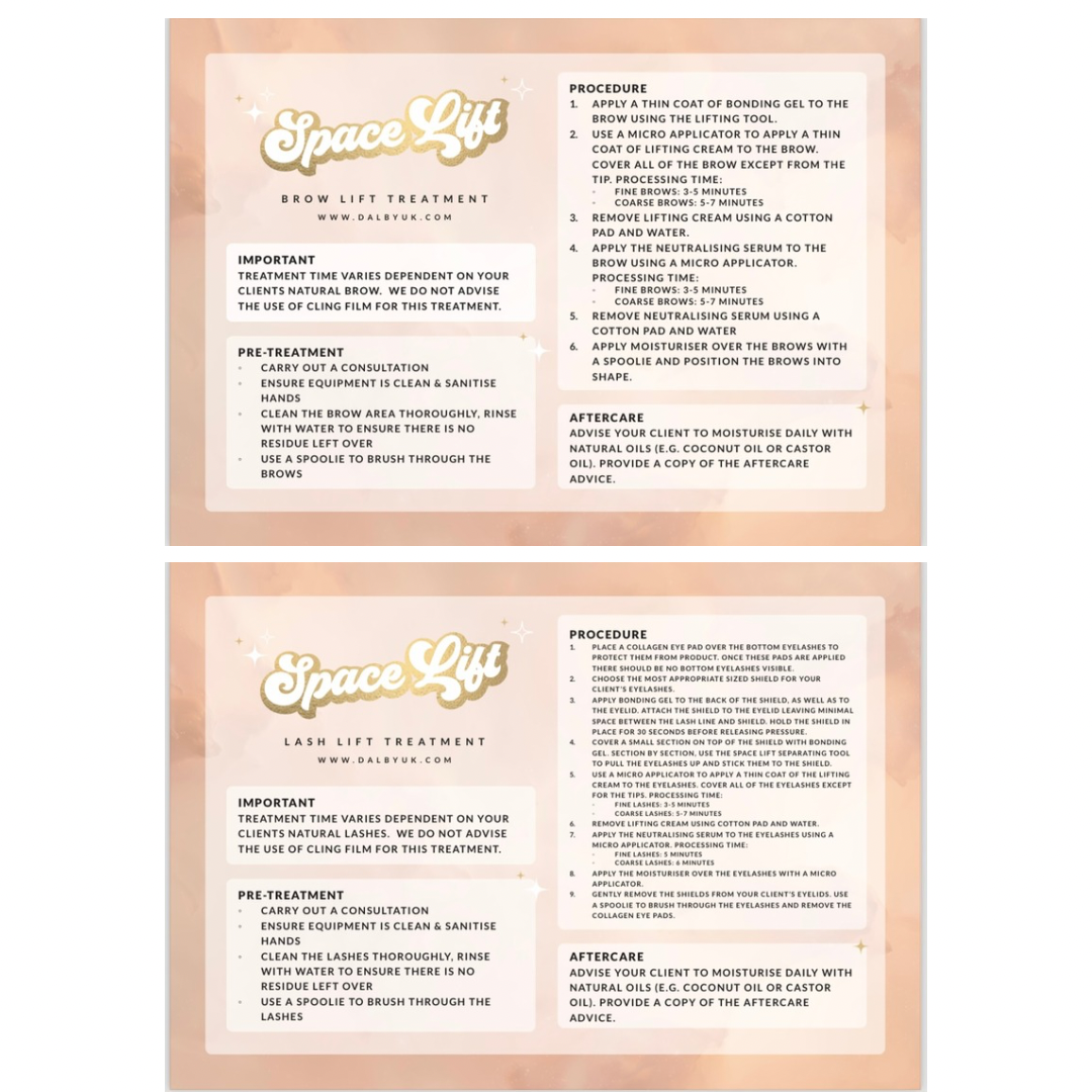 TREATMENT TIME VARIES DEPENDENT ON YOUR CLIENTS NATURAL LASHES/ BROWS. PLEASE READ INSTRUCTIONS PROVIDED FOR THE TREATMENT YOU ARE CARRYING OUT. WE DO NOT ADVISE THE USE OF CLING FILM FOR ANY TREATMENT.